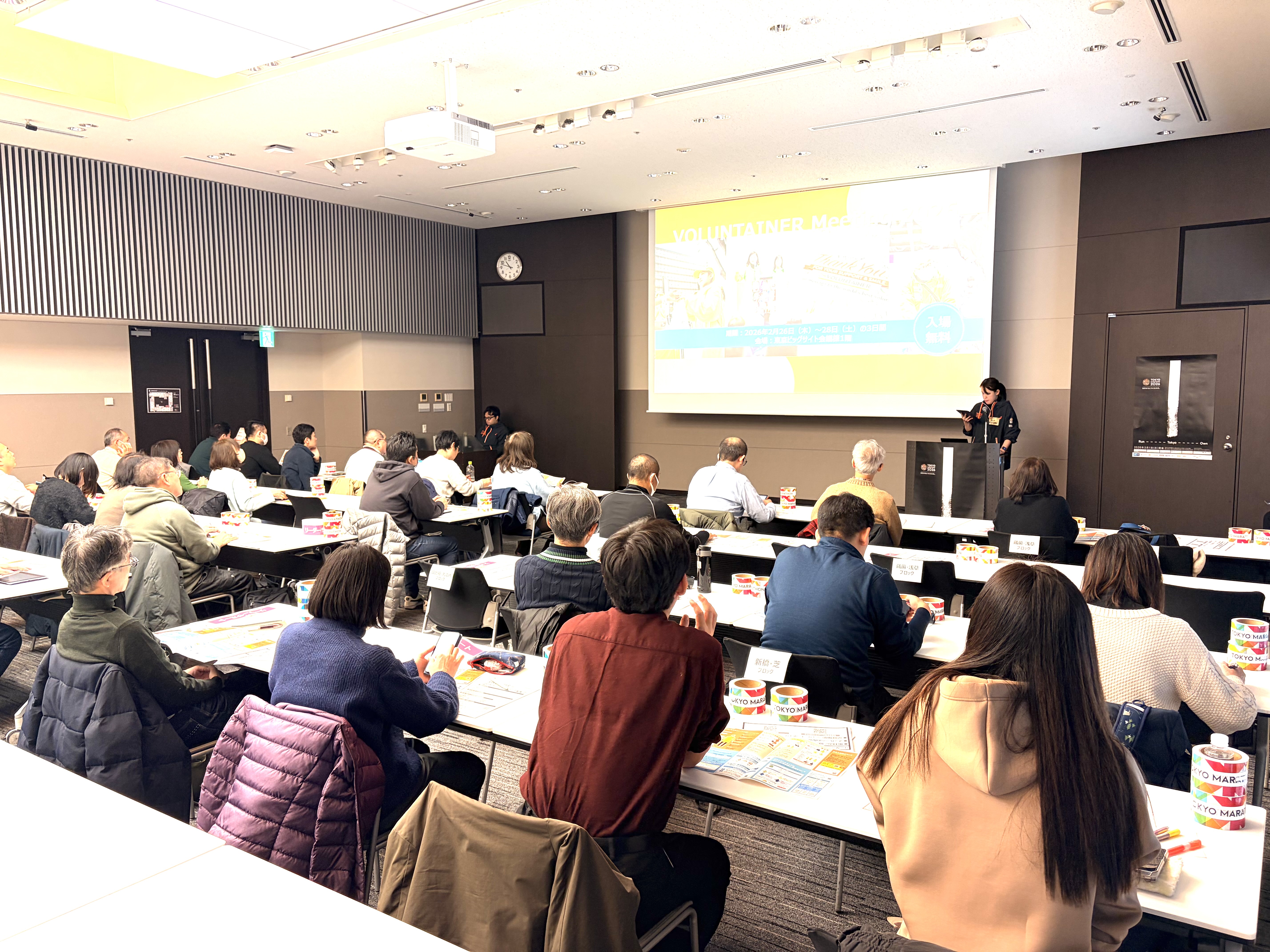 その後、東京マラソン財団スタッフの進行により東京マラソン2026の概要、前回大会からの変更点や主なポイントとして、当日の服装・持ち物チェックリスト、給水の運用や今大会から実施される「おもてなしエイド」、また、Global Volunteerの新設、ジュニアボランティア活動場所の拡大などについての説明が行われました。